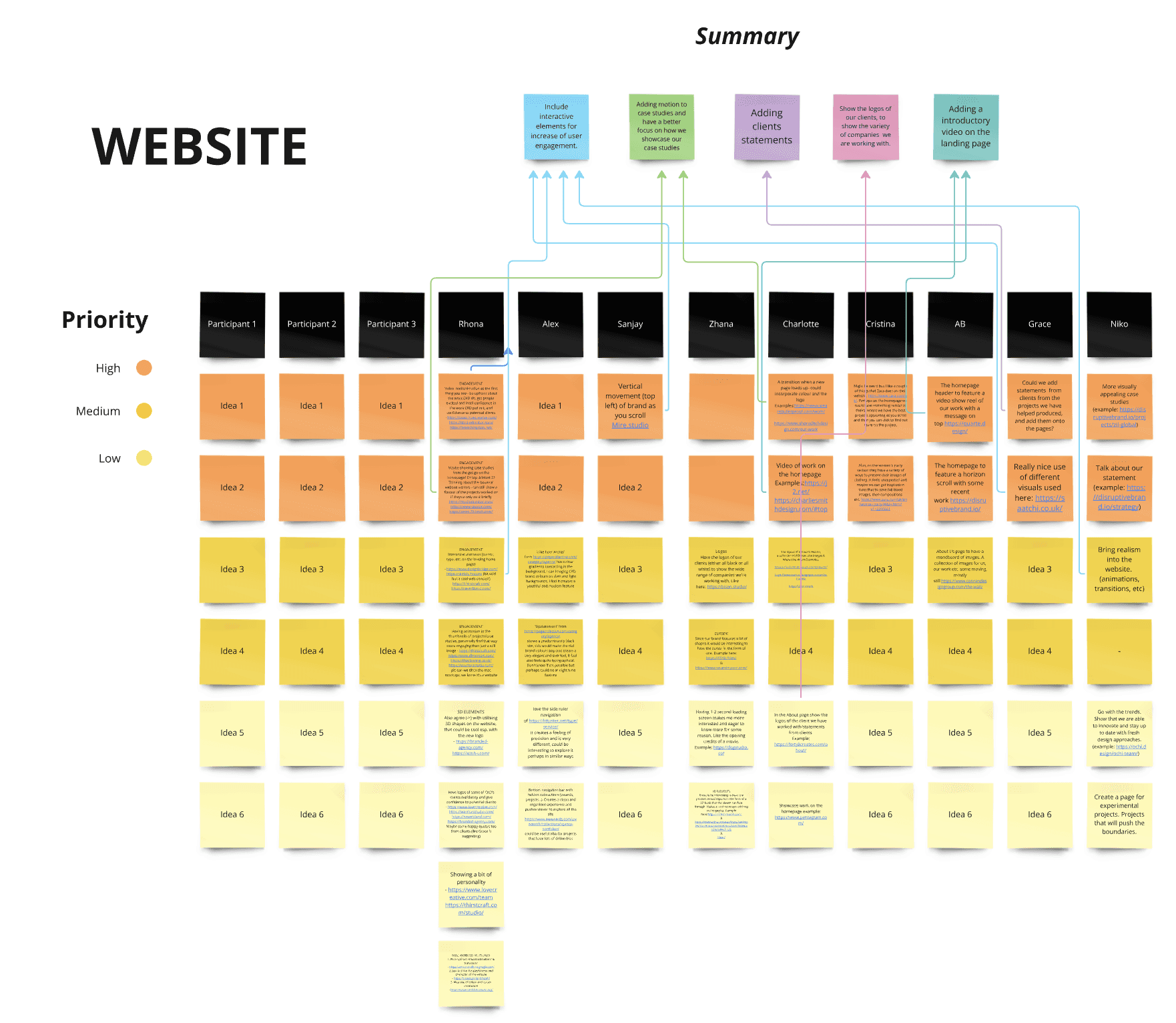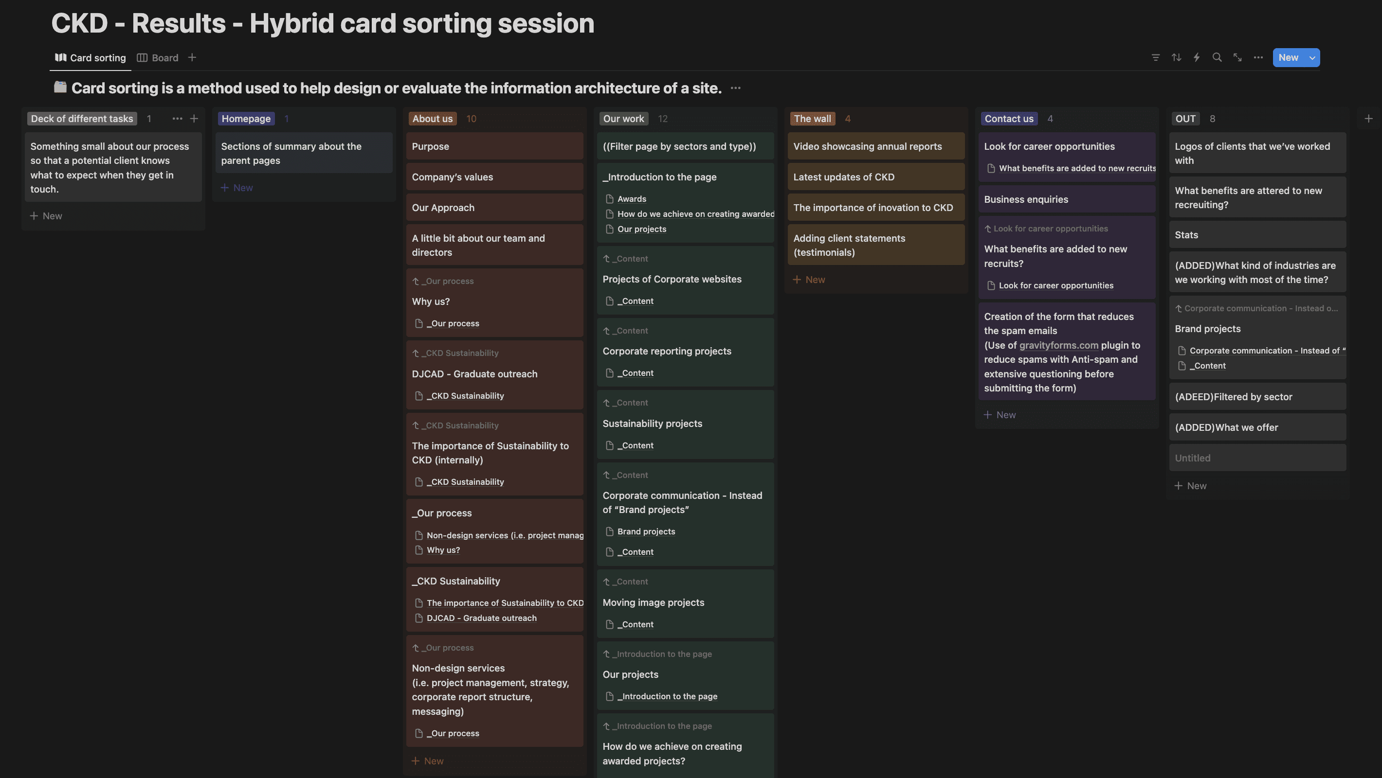 Following this, I conducted a hybrid card sorting session to gather and organize the ideas from the team. We then met to discuss and categorize these ideas into potential website pages.