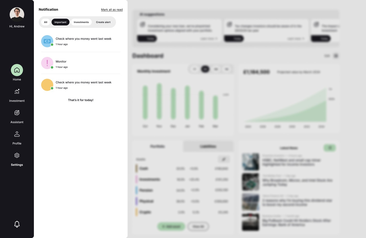 My WealthMaster is a financial platform that consolidates all your investments into a single portfolio, replacing manual asset management. It keeps you informed about your latest financial updates, suggests steps you can take to optimize your finances, and elevates your financial management experience.